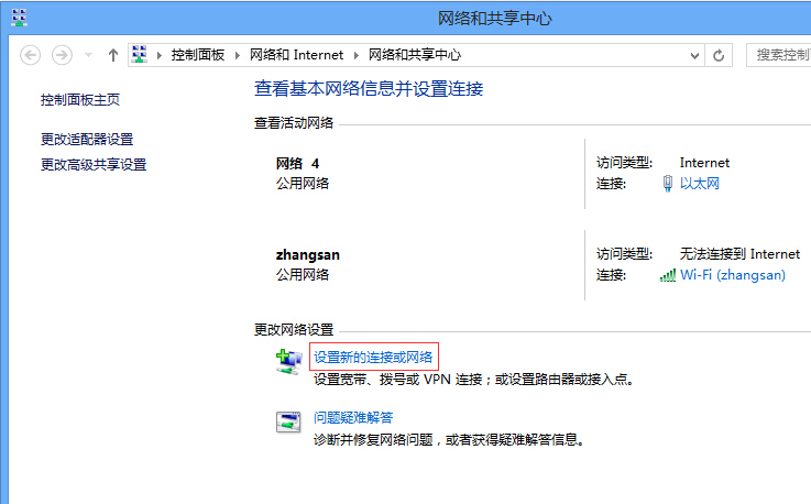 ,点击 打开网络和共享中心 (或 右键 桌面上的 网络, 点击 属性,进入 网络和共享中心 页面),并点击 设置新的连接或网络,如下图: